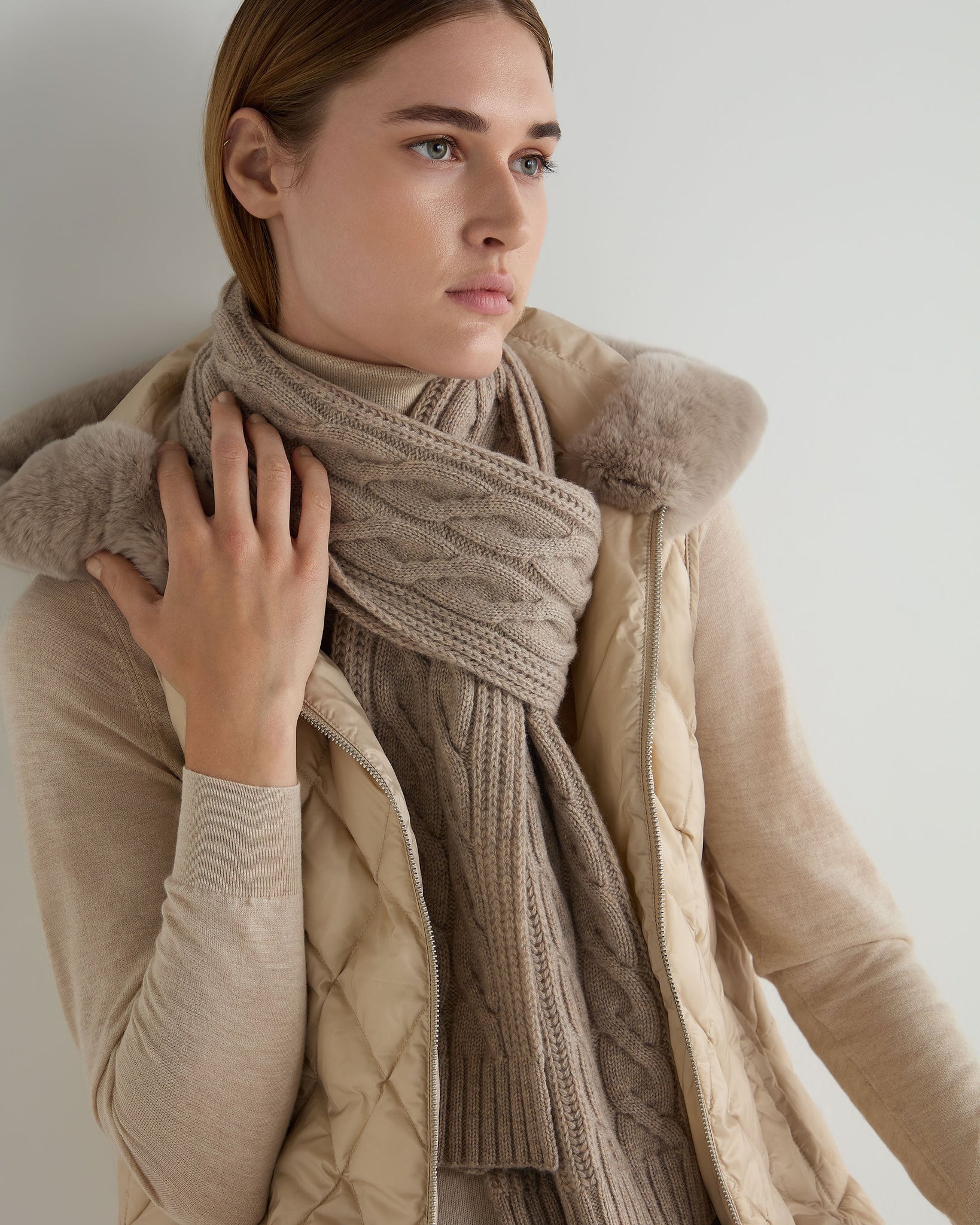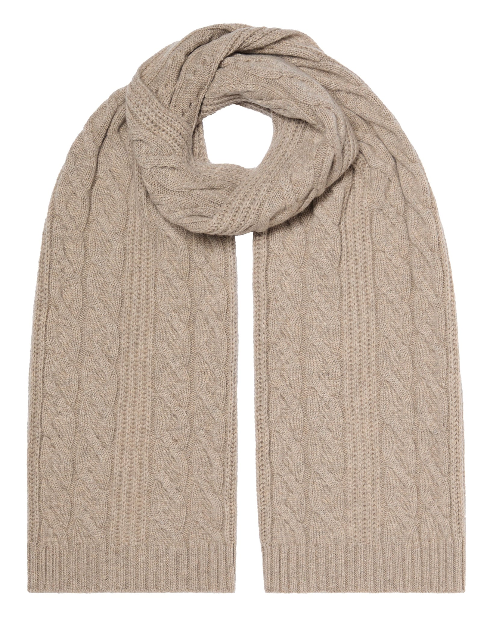 - Made from 100% organic Mongolian cashmere - Incredibly soft against the skin and beautiful colourations - Delightful cable and rib design - Measures a generous 182x26cm - 3ply - Care: Hand Wash
