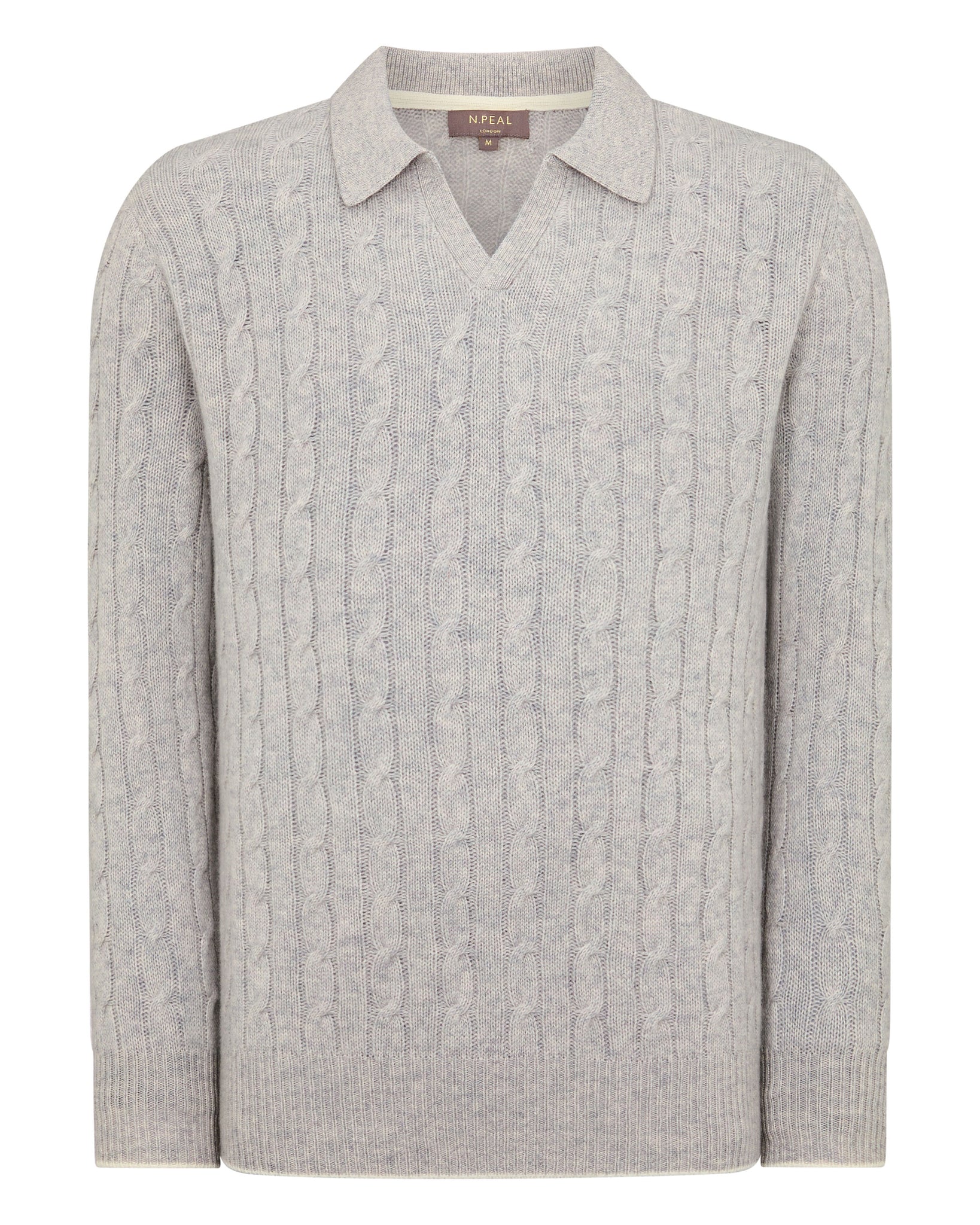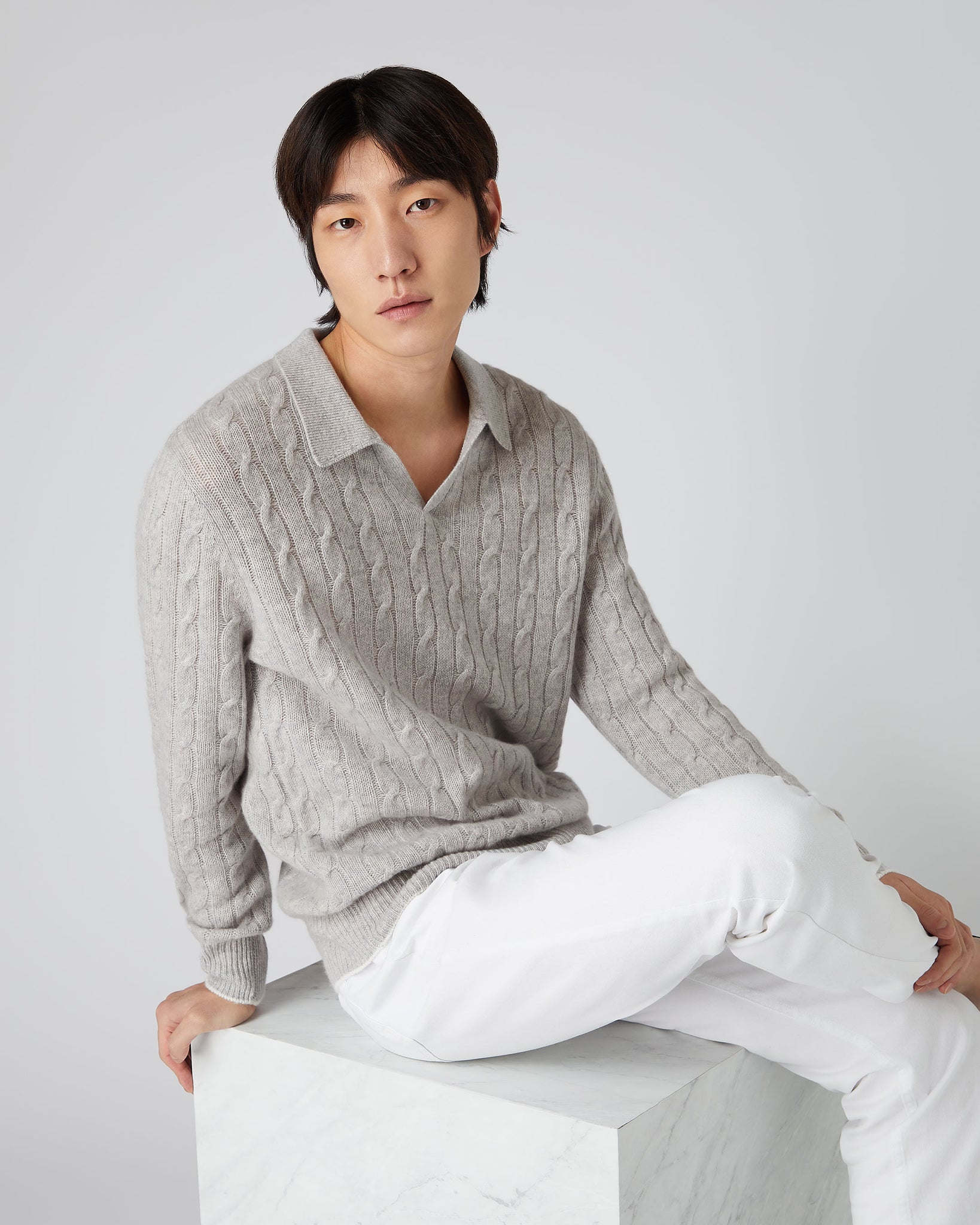 - Made from 100% organic Mongolian cashmere - Exquisite cable detail - Traditional polo collar design - Supremely soft against the skin - Perfect layered over a shirt or Tee - Model is wearing size Medium - Care: Hand Wash