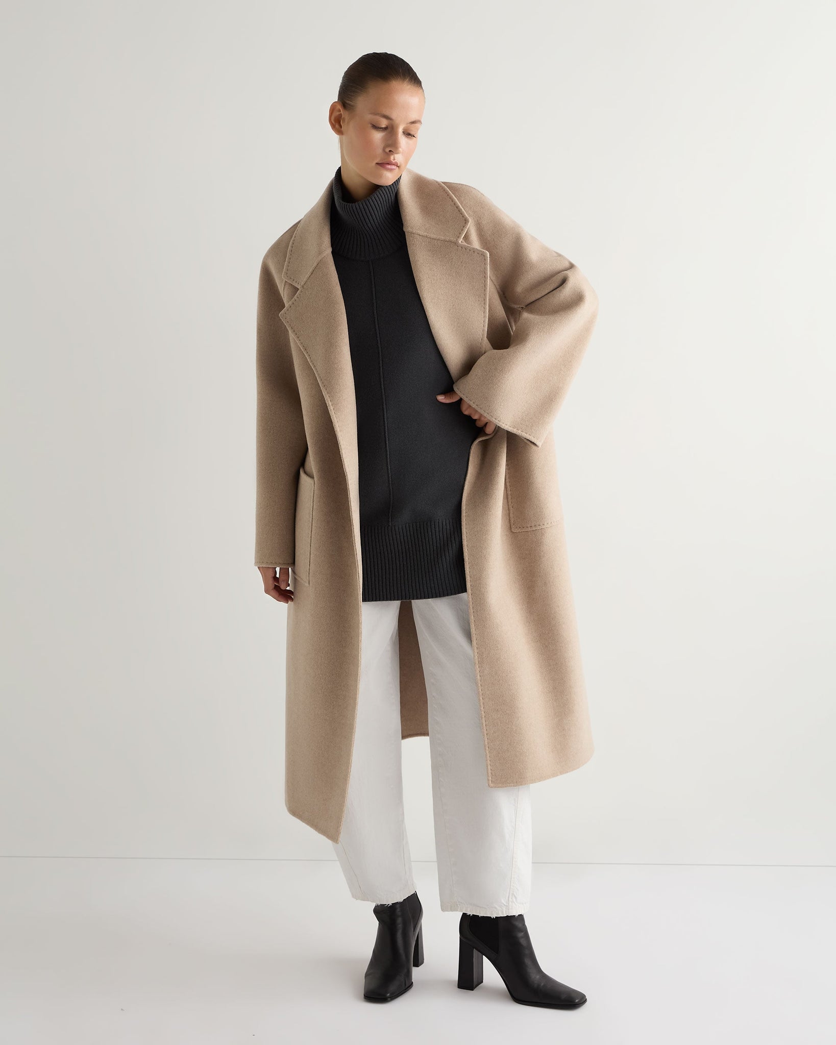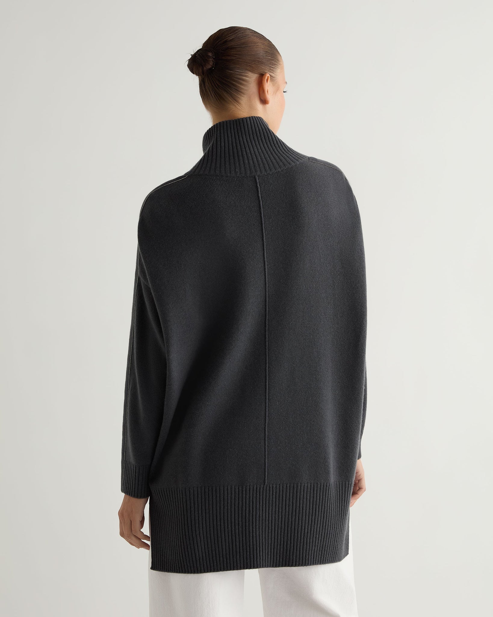 - Made form 100% organic Mongolian cashmere - Longer tunic-style design, perfectly warm and comfortable - Super comfortable mock neck design, elegant and flattering - Matching rib on hem, cuffs and neck - Side slits and dropped shoulders - Seam design detail running the length of the front and rear - 2ply - Model is wearing size Small - Care: Hand Wash
