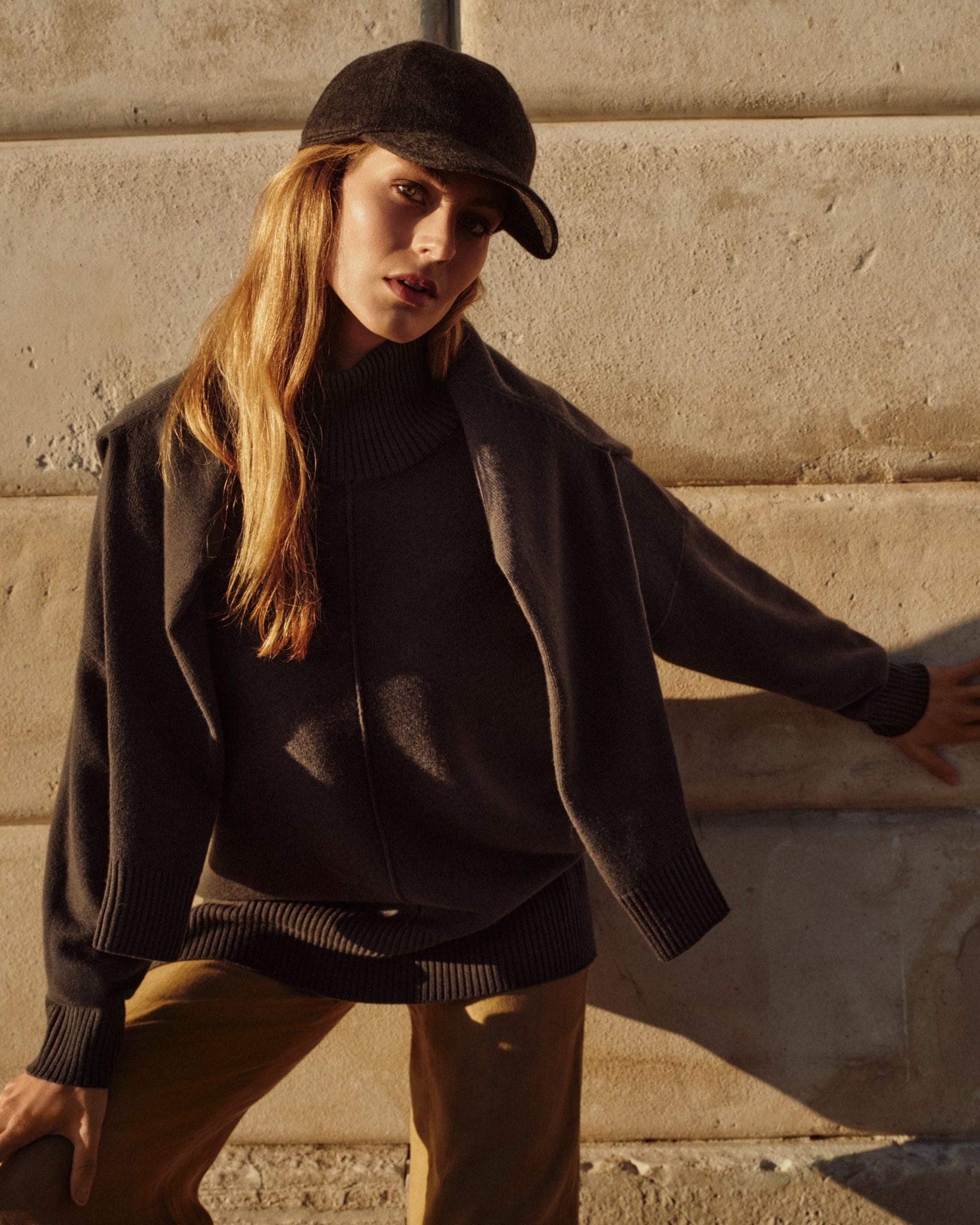- Made form 100% organic Mongolian cashmere - Longer tunic-style design, perfectly warm and comfortable - Super comfortable mock neck design, elegant and flattering - Matching rib on hem, cuffs and neck - Side slits and dropped shoulders - Seam design detail running the length of the front and rear - Model is wearing size Small - Care: Hand Wash