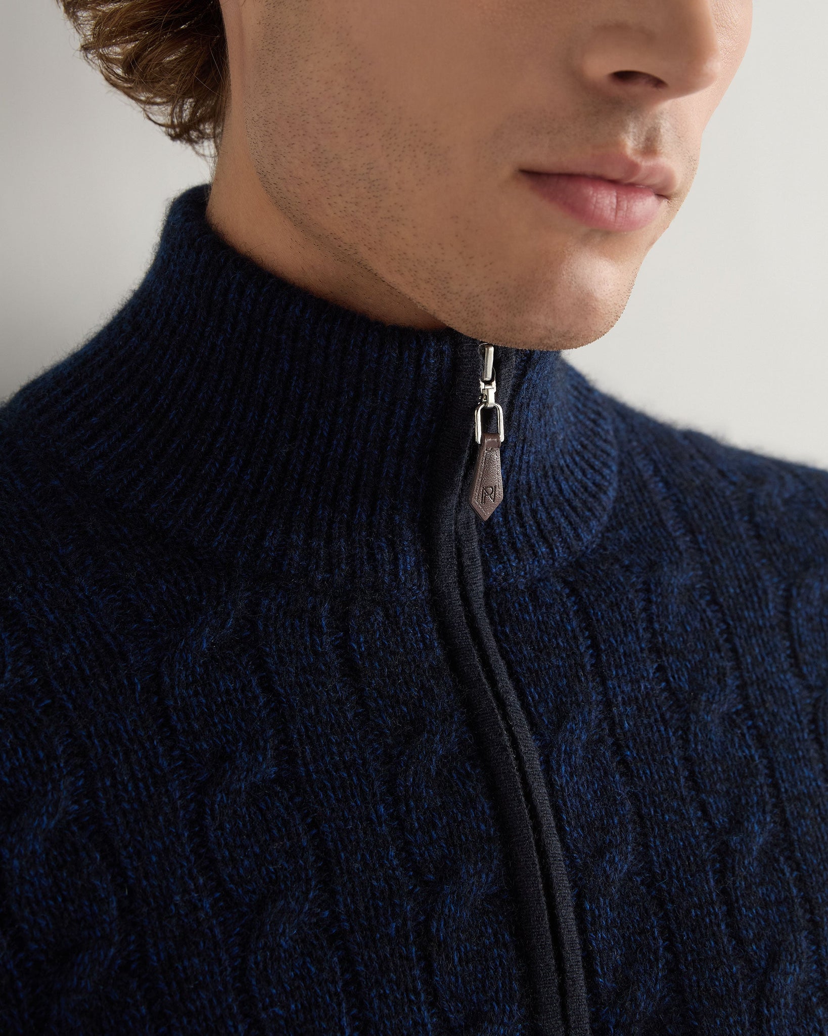 - 100% Mongolian organic cashmere - Cable knit design - Elegant half zip with leather toggle - Alcantara piping - Great layering piece - Delicate navy blue contrast on the cuff tip - 2ply - Model is wearing size Medium - Care: Dry Clean Only