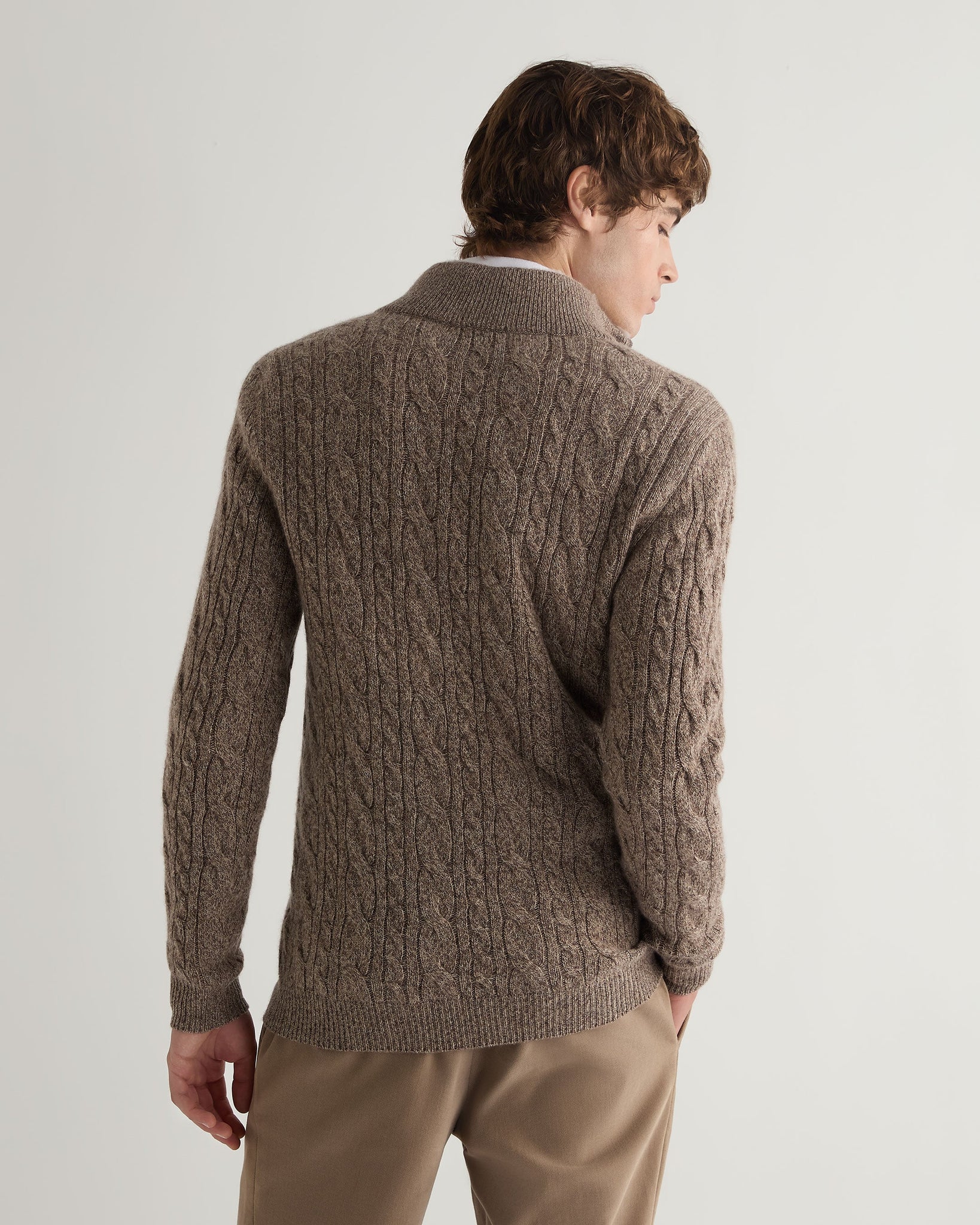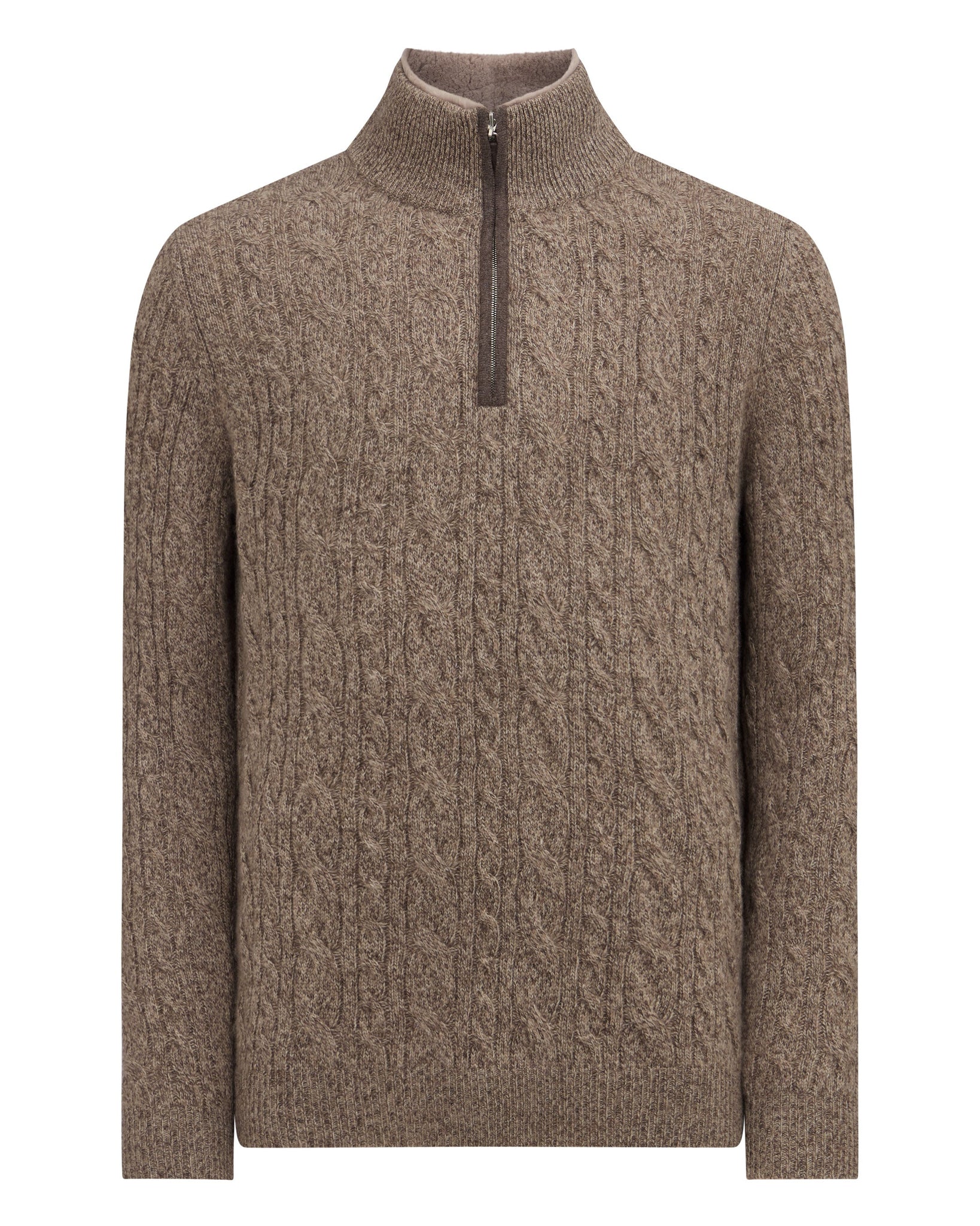 - Made from 100% Mongolian cashmere with a toast brown rex fur inner collar - Super popular half zip style - Zip fastening with our distinctive leather toggle - Mixed cable knit pattern front, back and both arms - Smart matching rib knit collar, cuffs and hem - Fabulous worn over a T-shirt , a crisp white shirt or supersoft alone against the skin - 2ply - Model is wearing size Medium - Care: Hand Wash