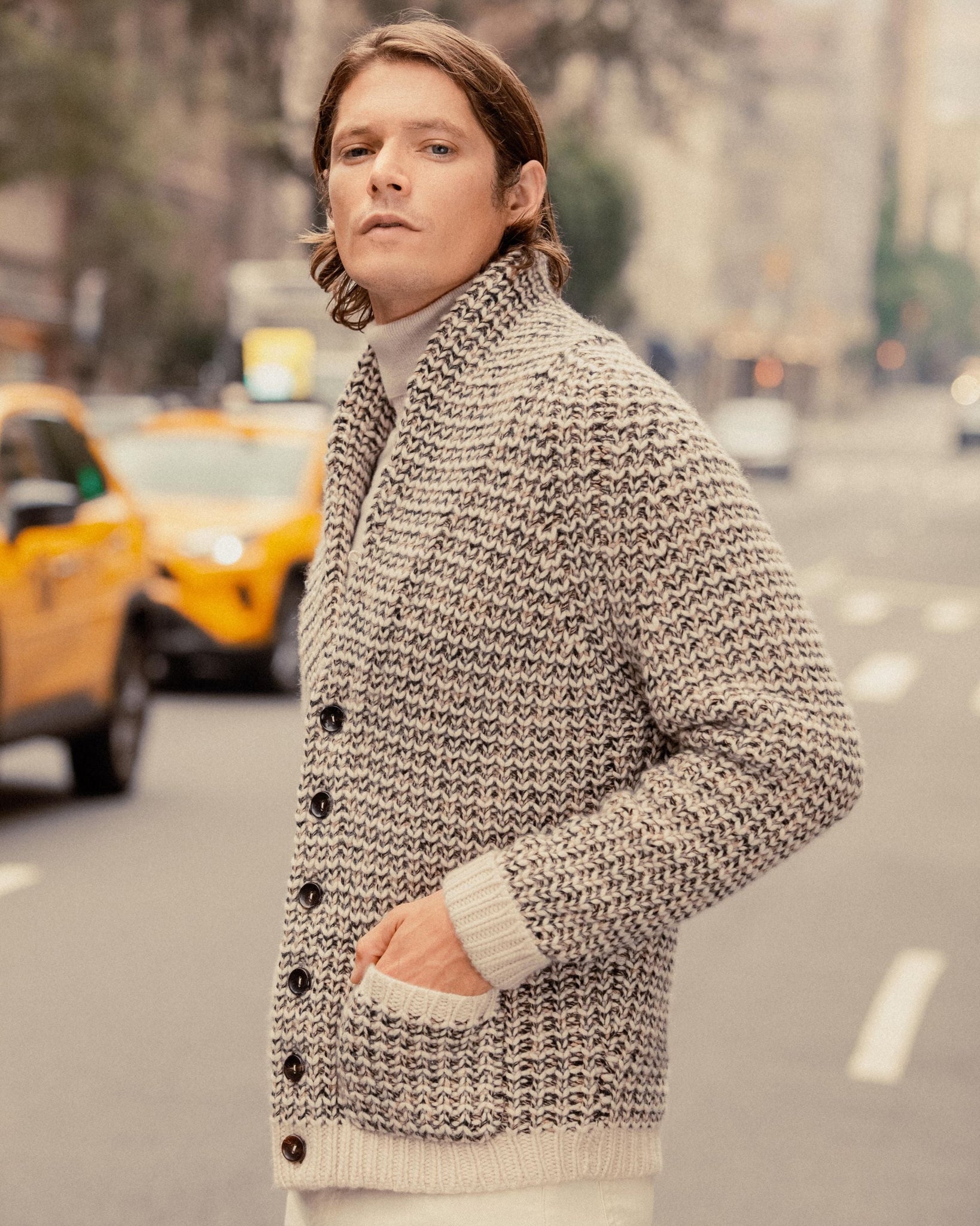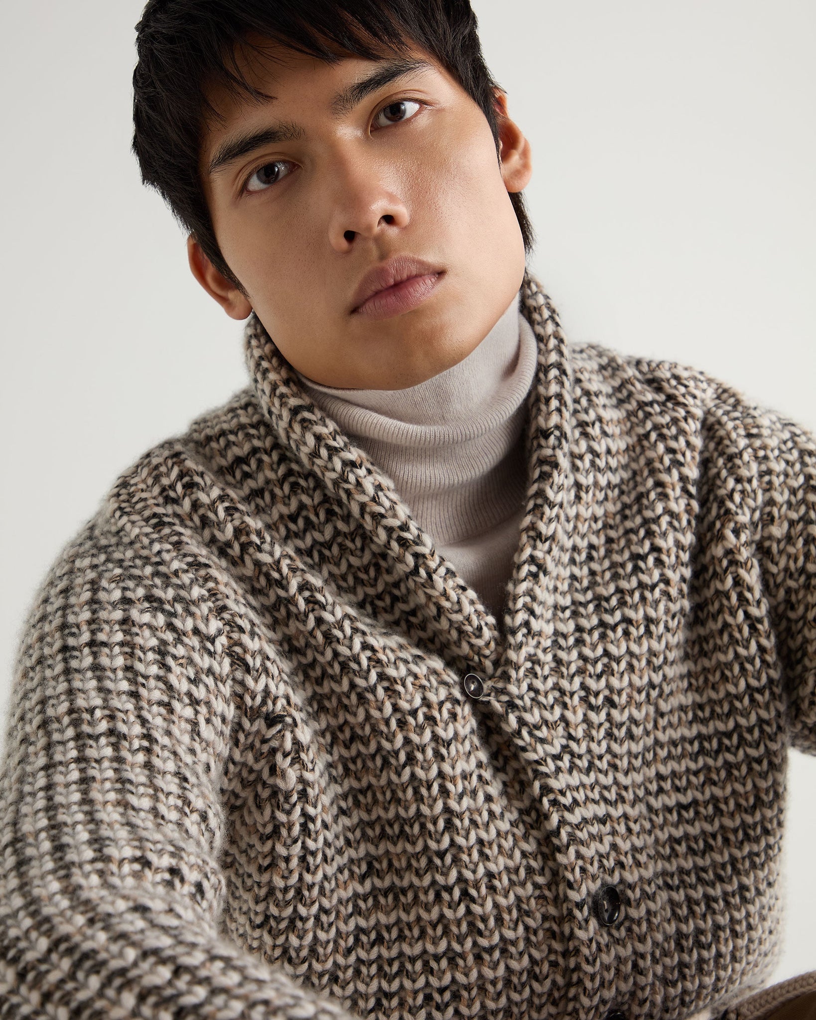 - The unique marl texture adds depth and character in a blend of ecru, black and camel