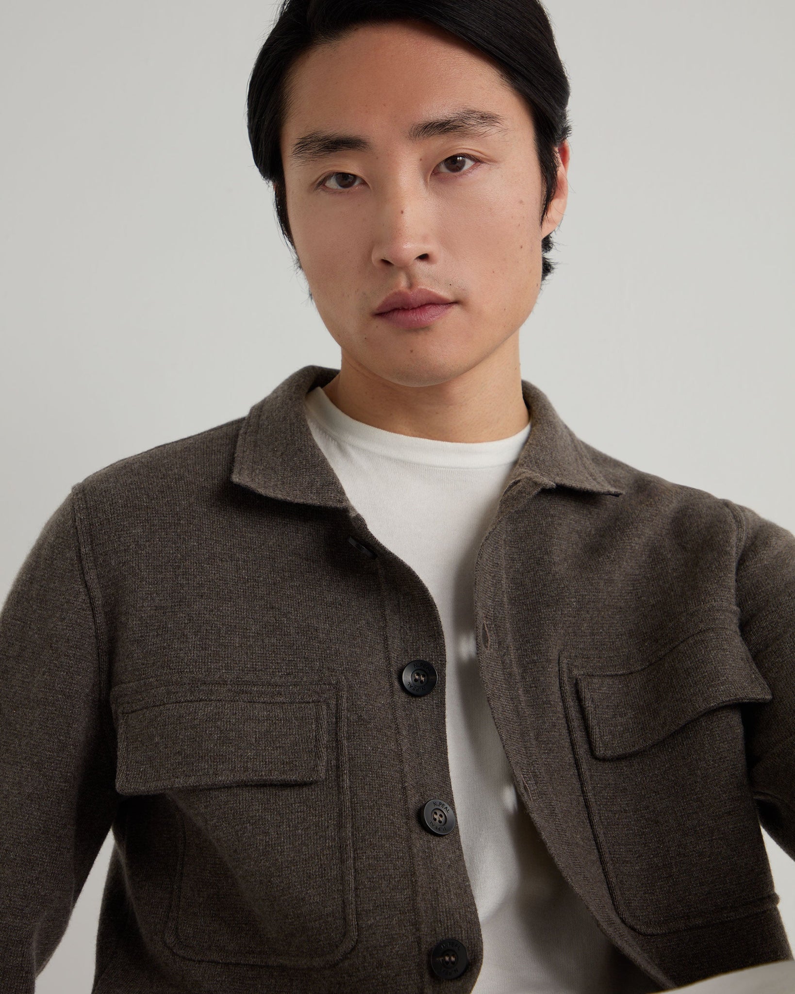 - Made from 100% organic Mongolian cashmere of the finest quality - Either can be worn as a lightweight jacket or an overshirt - Ideal layering piece for transitioning weather - Designed with a relaxed yet tailored fit - Featuring a buttoned down front and two chest pockets - Jacket style collar - Perfect for casual or smarter settings - 1ply - Model is wearing size Small-Medium - Care: Dry Clean Only