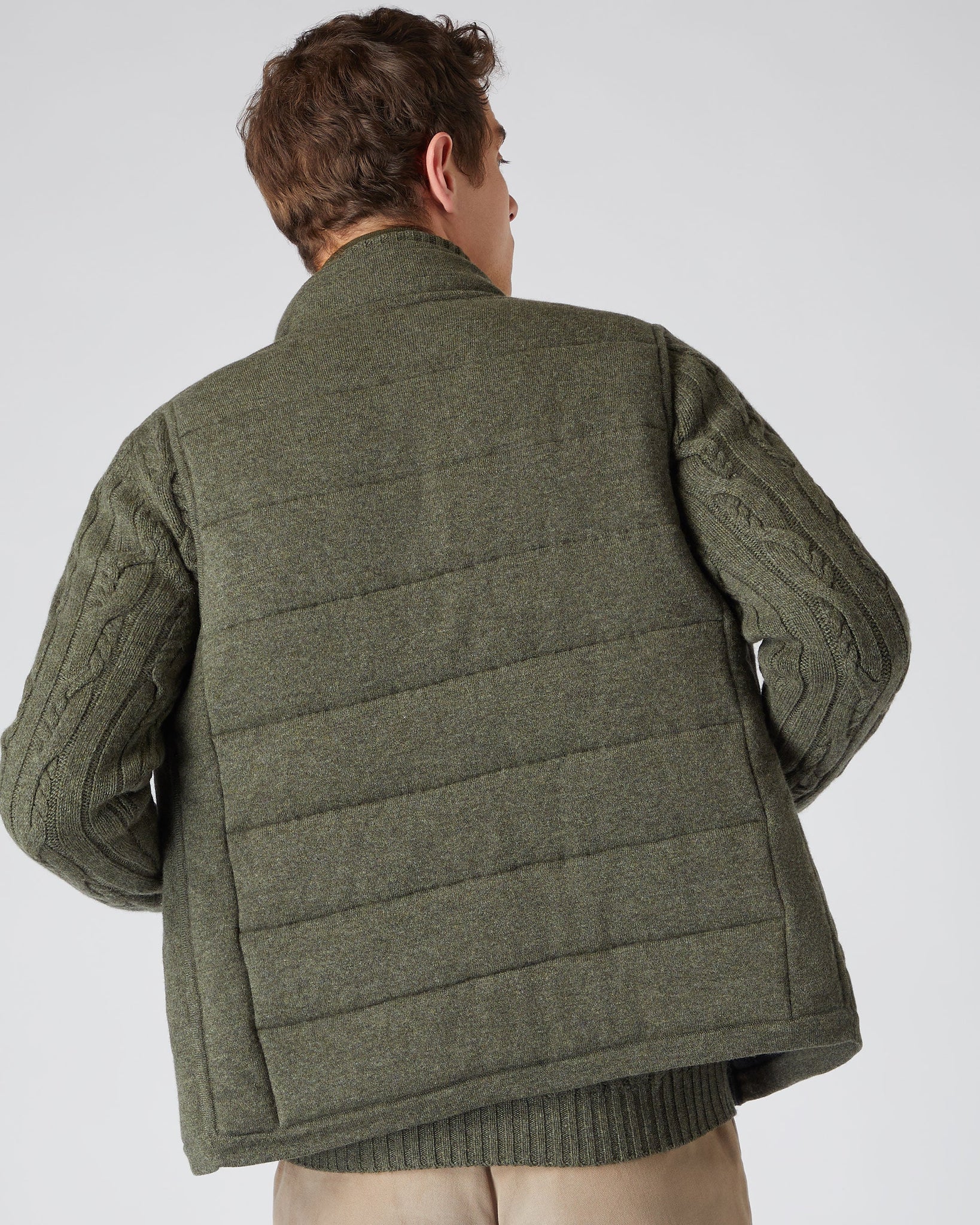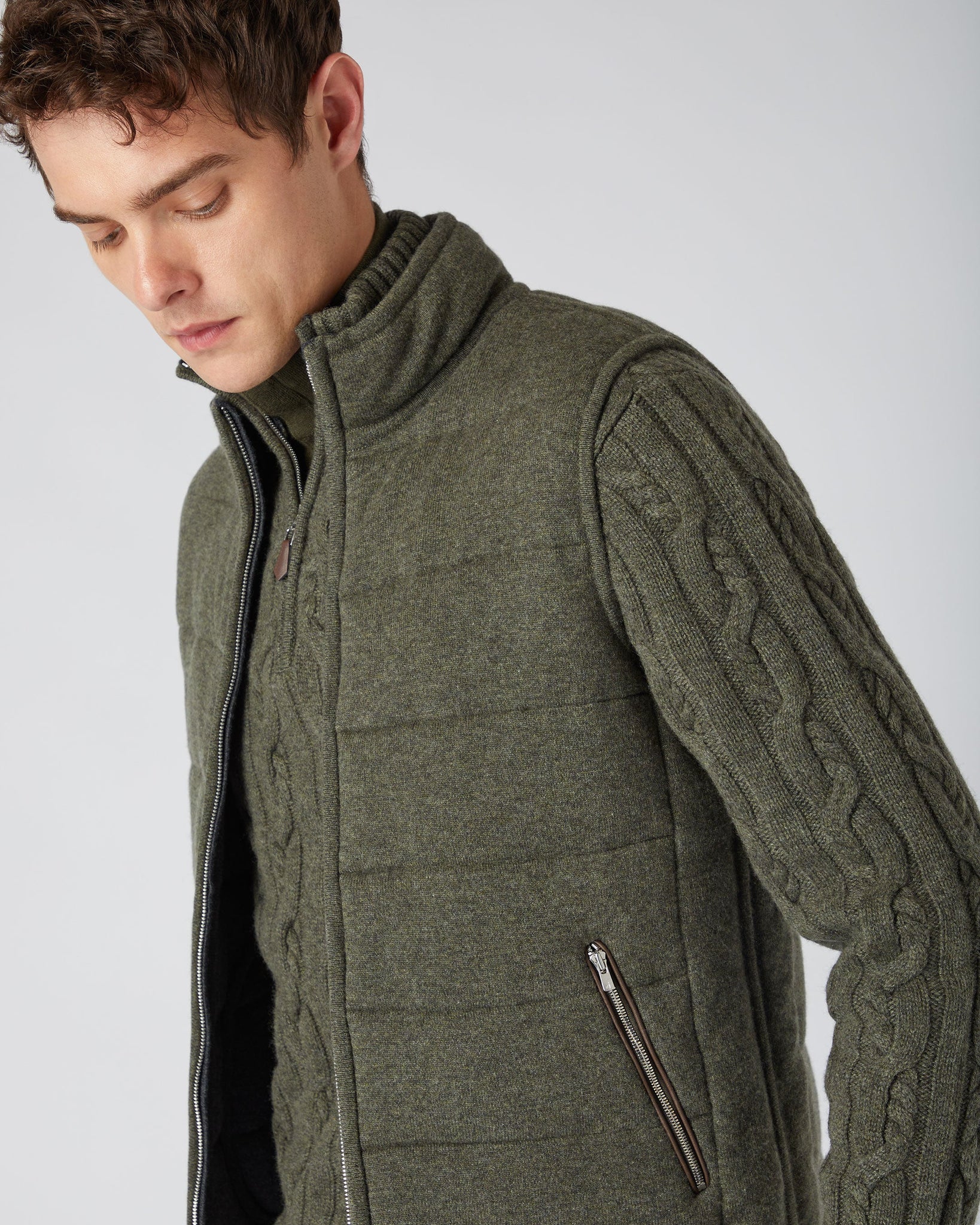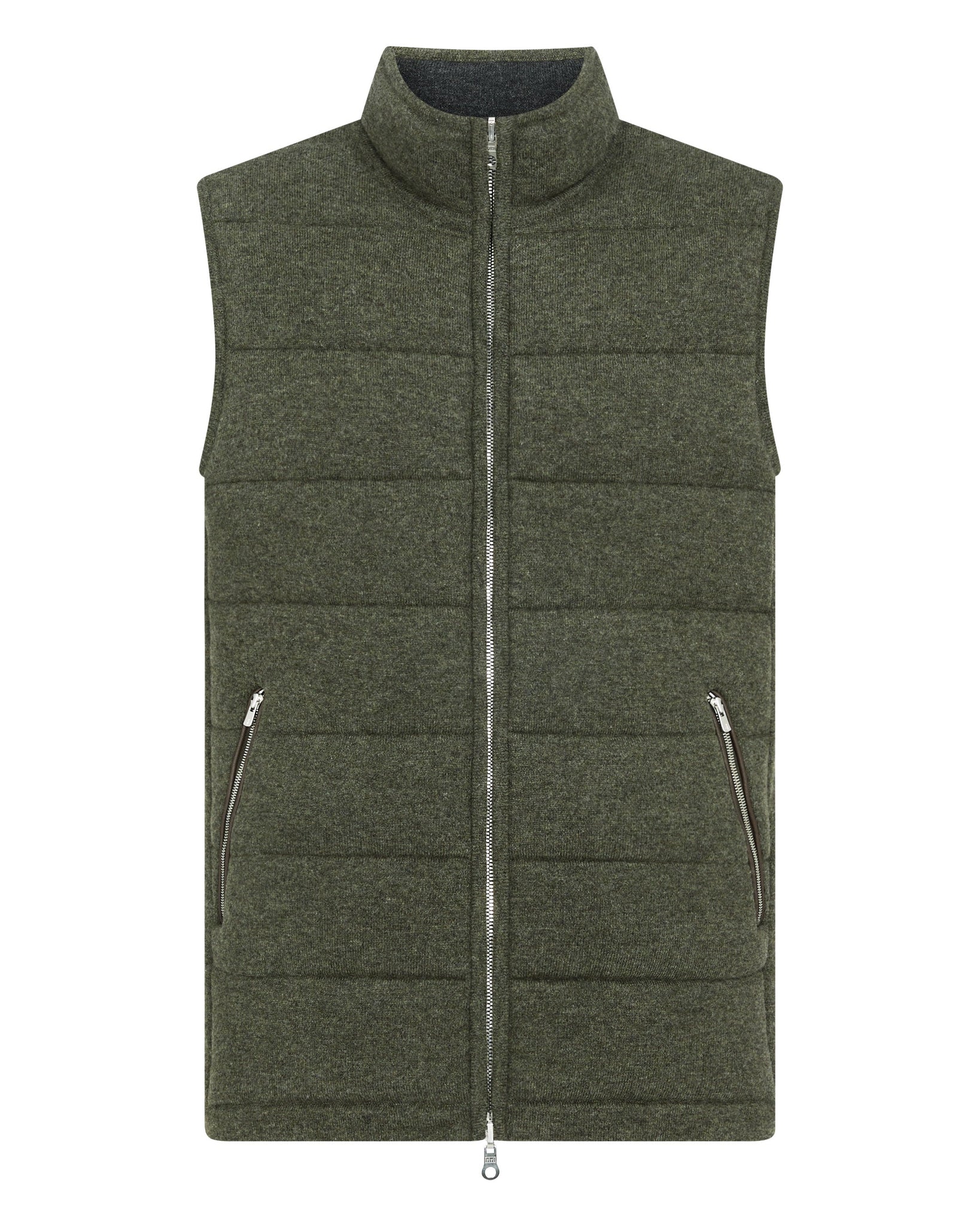 - Made from 100% Organic Cashmere - A beautiful and versatile piece - Quilted for extra warmth - Moss green outer and dark charcoal grey on the reverse - Useful zip pockets - Practical and good looking layering piece - Model is wearing size Medium - Care: Dry Clean Only