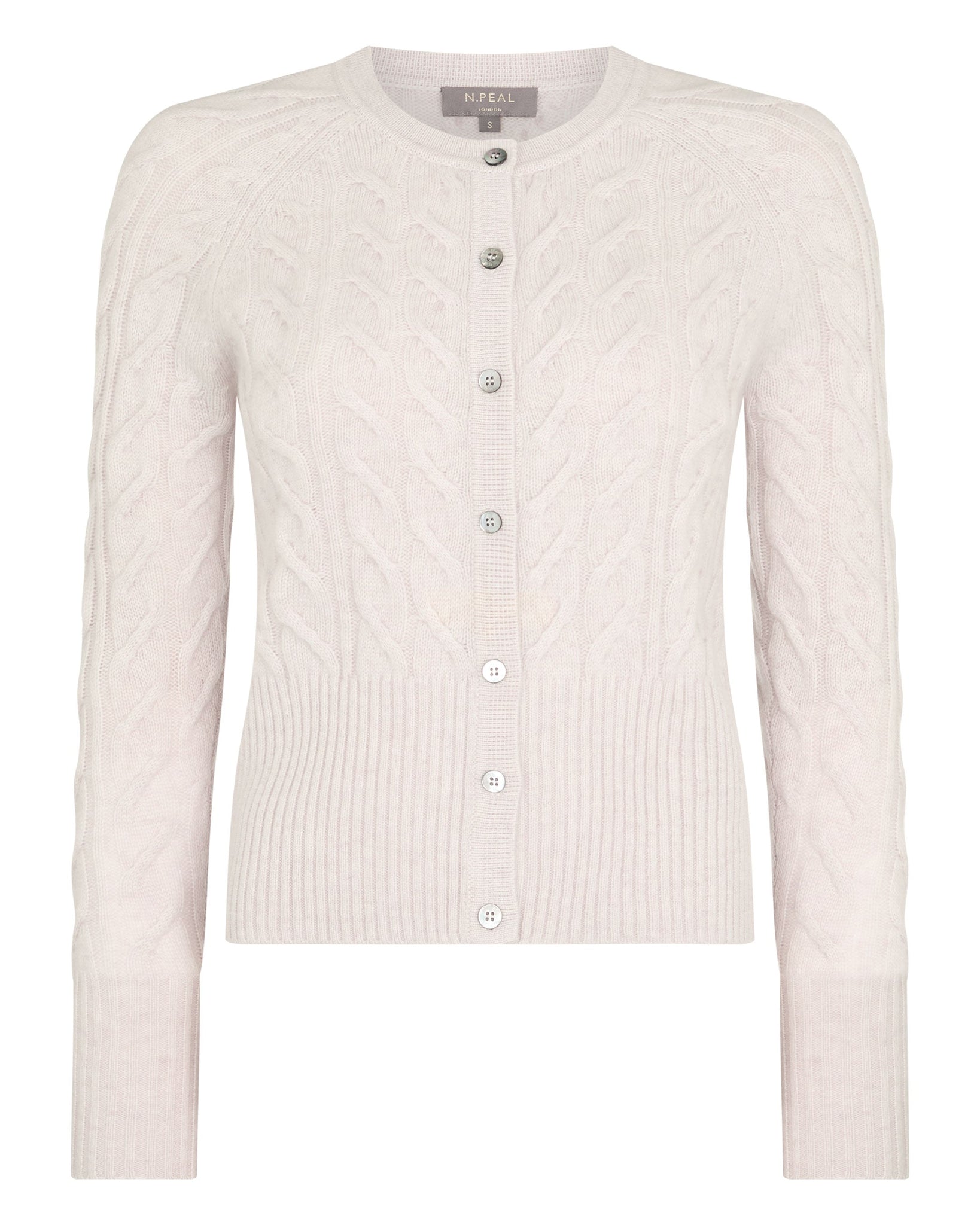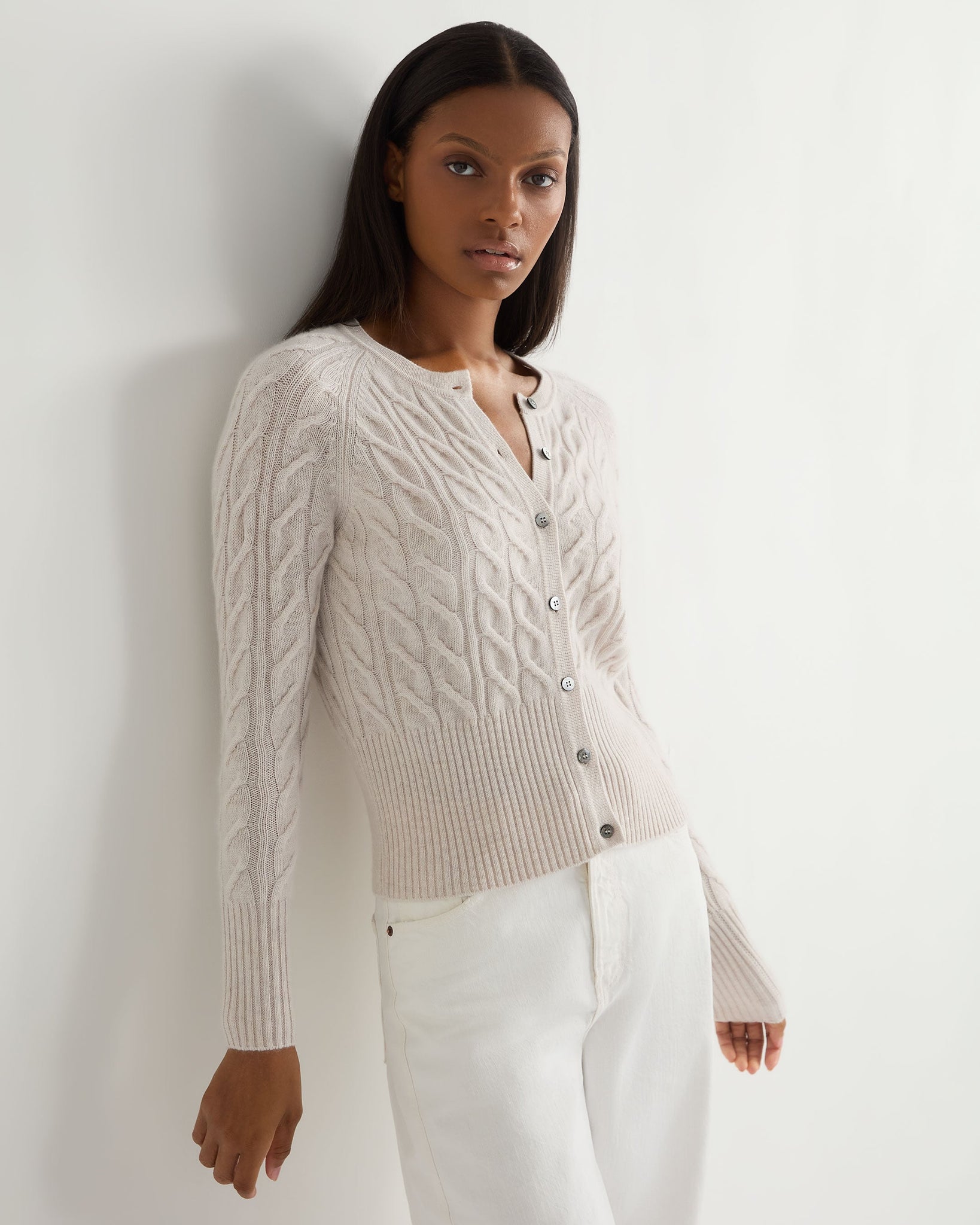 - 100% Mongolian Organic Cashmere - Popular cropped cardigan style - Modern cable texture - Mother of pearl buttons - Deep ribbed hem and matching cuffs - 2ply - Model is wearing size Small - Care: Hand Wash