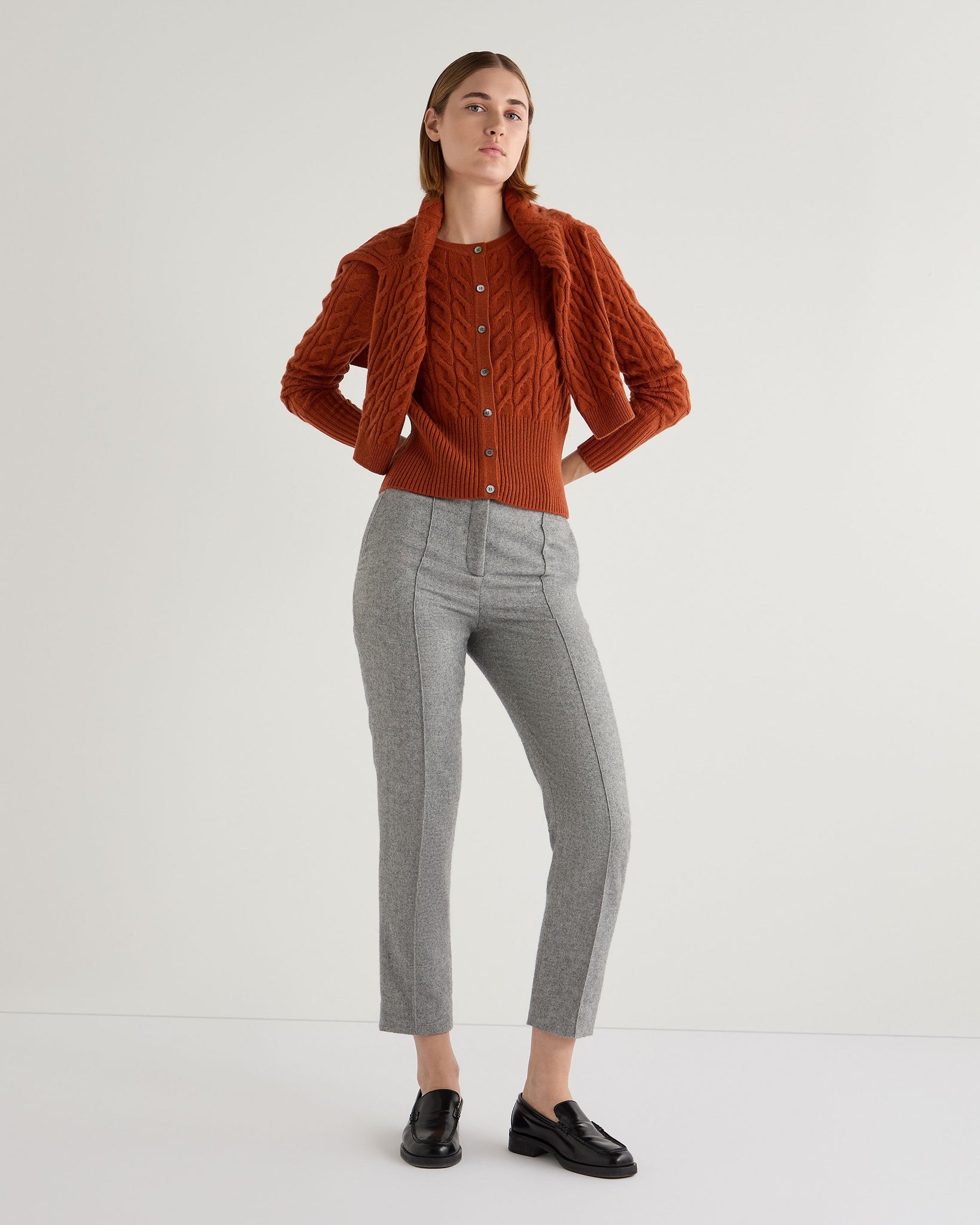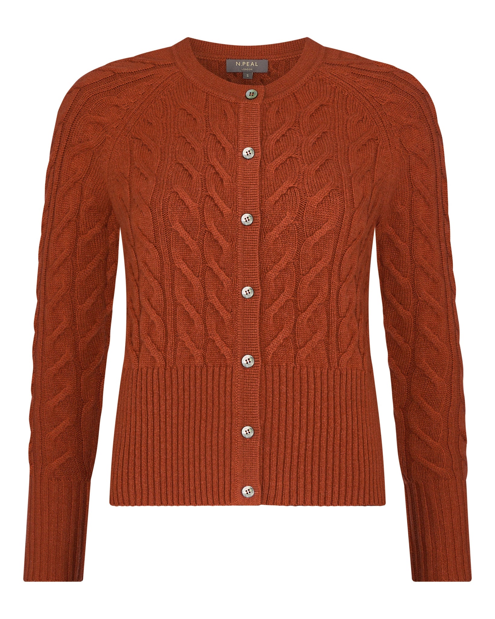 - Crafted from 100% Mongolian organic cashmere - Popular cropped cardigan style - Modern cable texture - Mother of pearl buttons - Deep ribbed hem and matching cuffs - 2ply - Model is wearing size Small - Care: Hand Wash