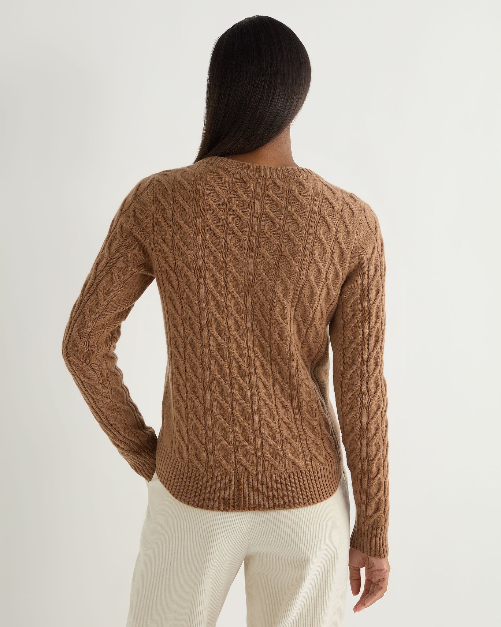 - Made from 100% organic Mongolian cashmere of the highest quality - Popular cable design, vertical for a flattering feel - V neck, perfect to wear alone or layer over a T-shirt or shirt - Matching rib detail on cuffs, hem and collar - 2ply - Model is wearing size Small - Care: Hand Wash
